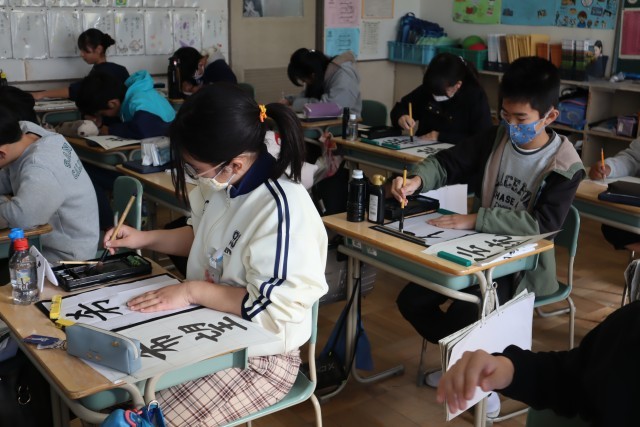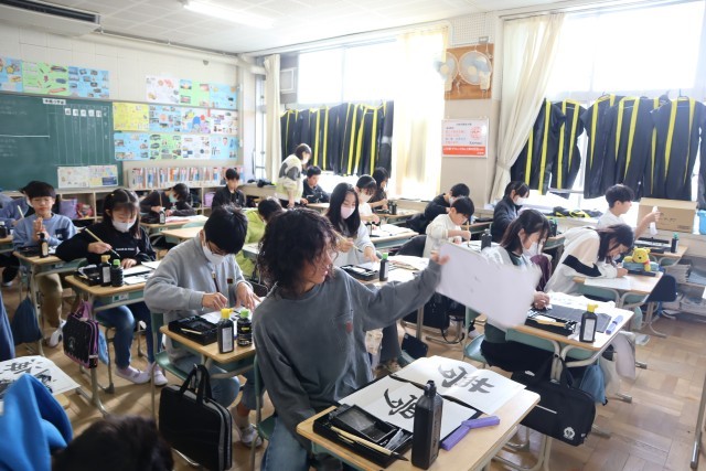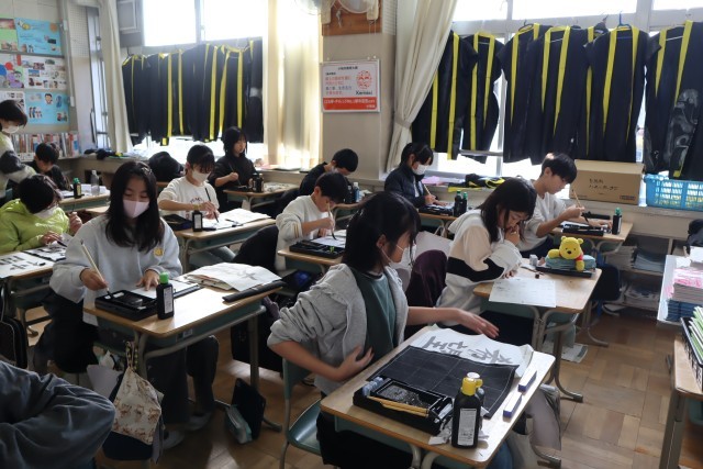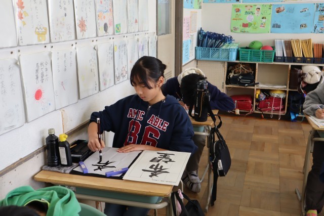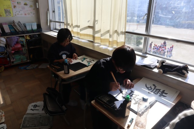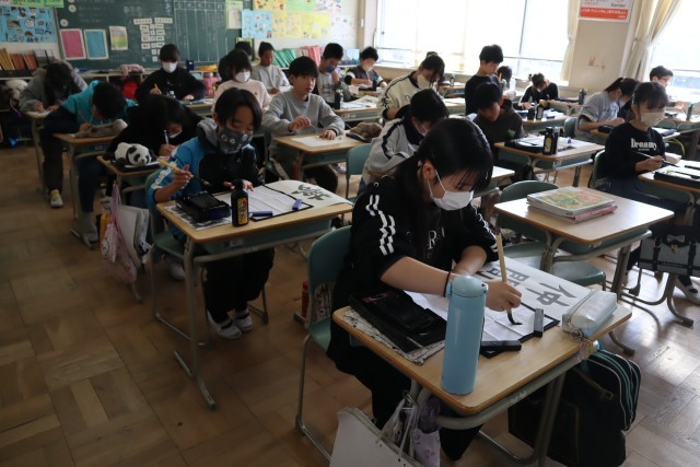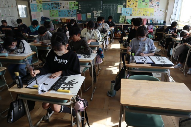 今回はいくつかのお手本の中から自分で選んだ文字を書いています。「夢」や「希望」などの文字を丁寧に力強く書いていました。