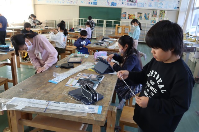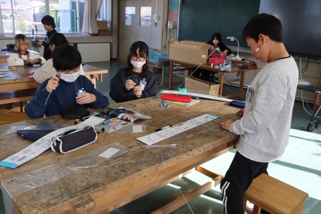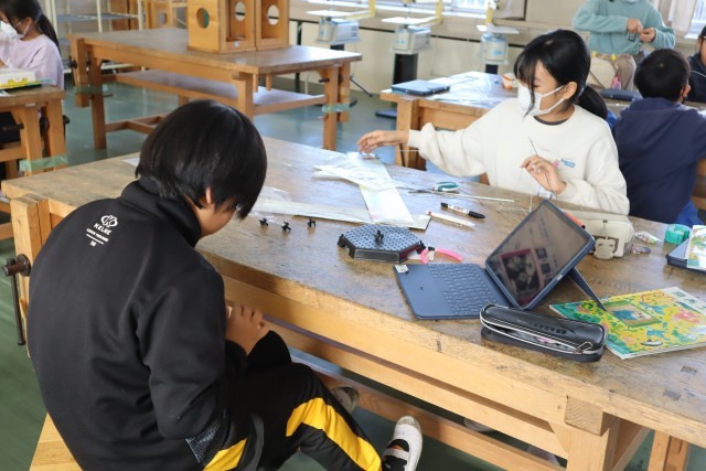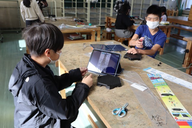 動物や水槽、タワーなど、アイデアいっぱいの作品を考えています。どのように固定したらいいか、工夫しながら制作していこう。