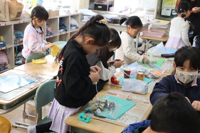 どんぐりや松ぼっくりをたくさん集めて、こまやけん玉などを作っていました。楽しいおもちゃがたくさんできました。