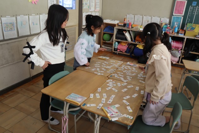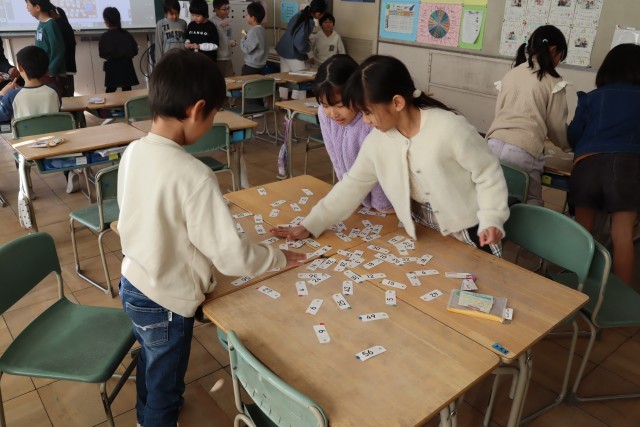 九九を読み上げて、答えのカードを素早く取っていきます。楽しく九九の勉強ができてとてもいいですね。