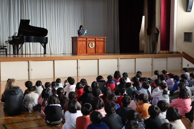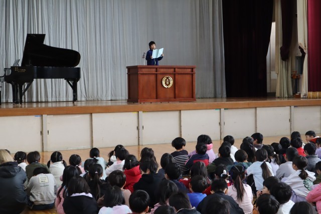 3人の児童が2学期の振り返りと来年の目標を発表してくれました。全校で校歌を歌うのも今年最後でしたね。行事など盛りだくさんの2学期を通して、みんなは大きく成長しました。3学期に、またみんなが元気に登校してくれること、そしてこれまで以上の成長をしてくれることを期待しています。3学期にまたみんなと会えることを楽しみしています。