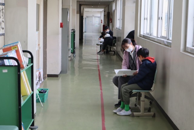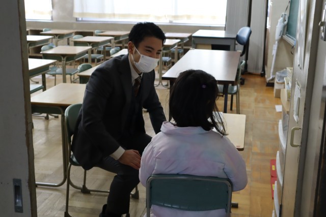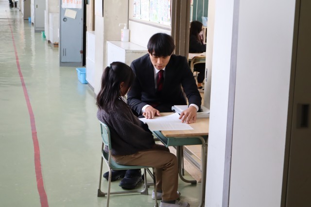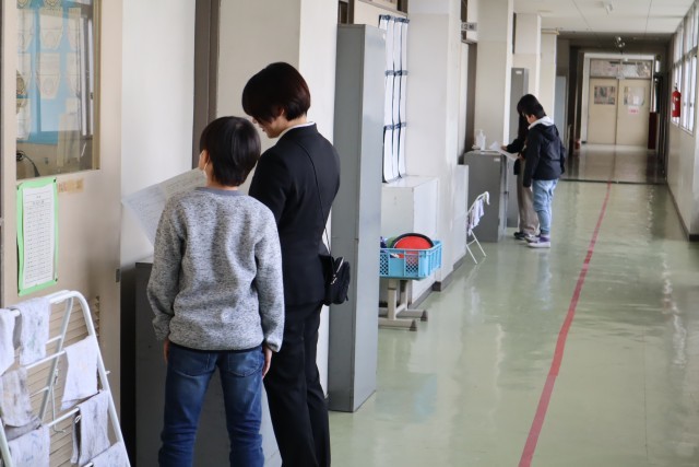 担任の先生から2学期の振り返りをしながら通知票が渡されています。よかったところ、頑張るところをしっかりと確認して、3学期の生活や学習の目標を立てていきましょう。