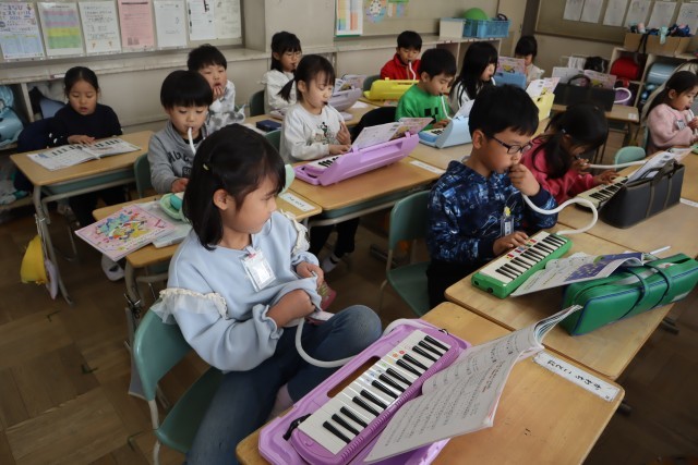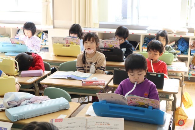 鍵盤ハーモニカで「きらきら星」の練習をしています。
