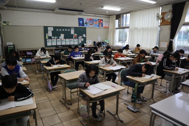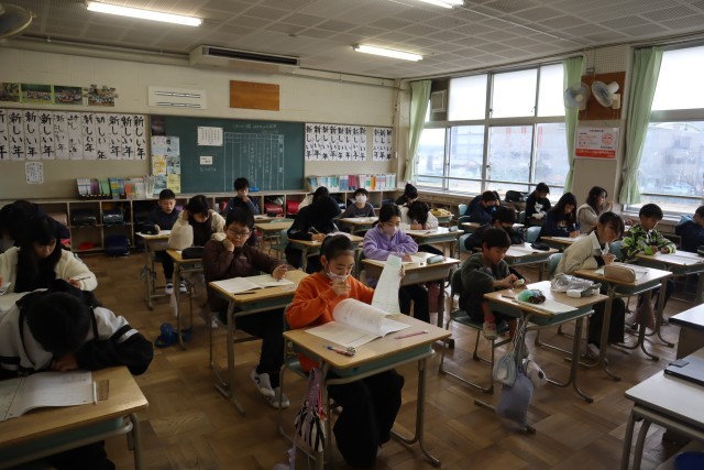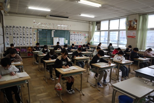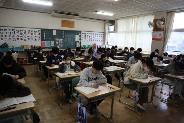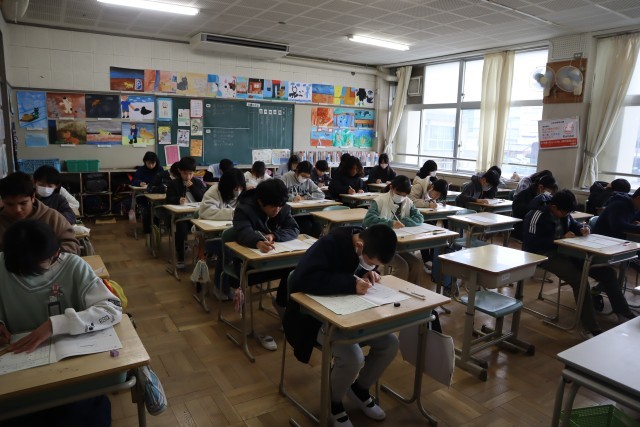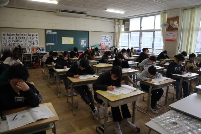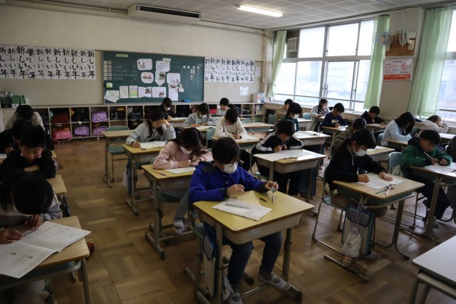 計算問題や文章題など、いろいろな問題が出題されています。計算間違いをしないように、丁寧にじっくりと取り組んでいました。