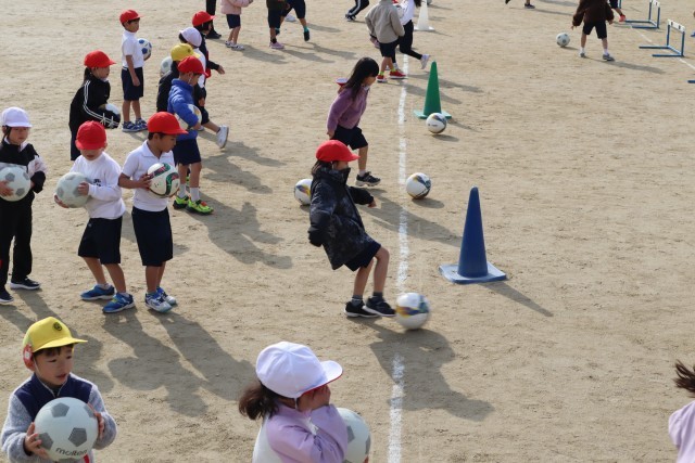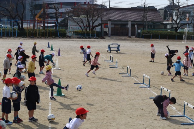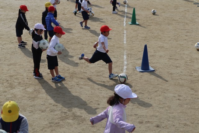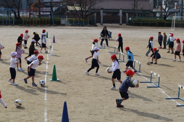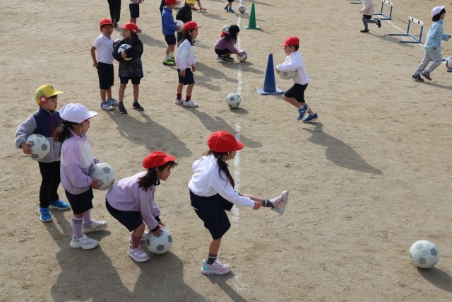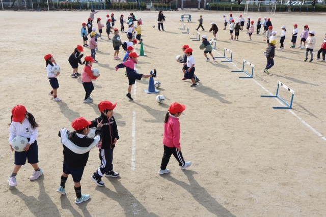 置かれたハードルの穴を狙って、力強くボールを蹴ります。しっかりとねらい通りに蹴ることはできたかな?