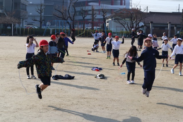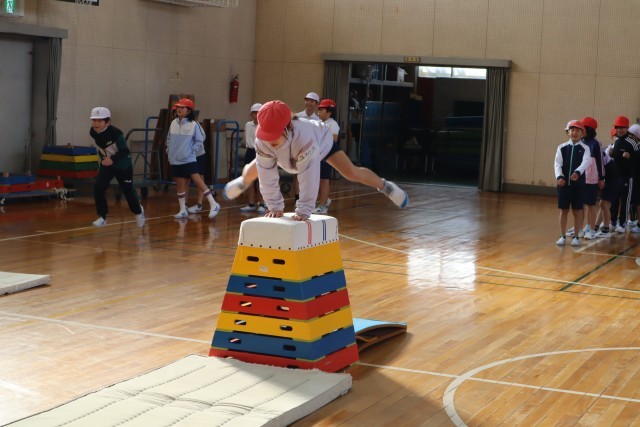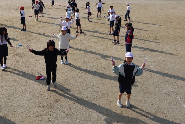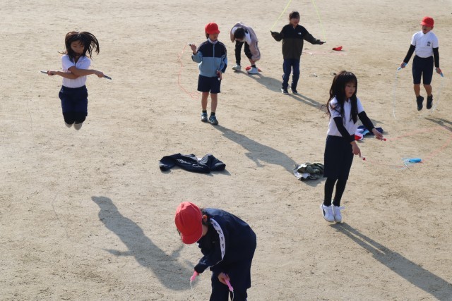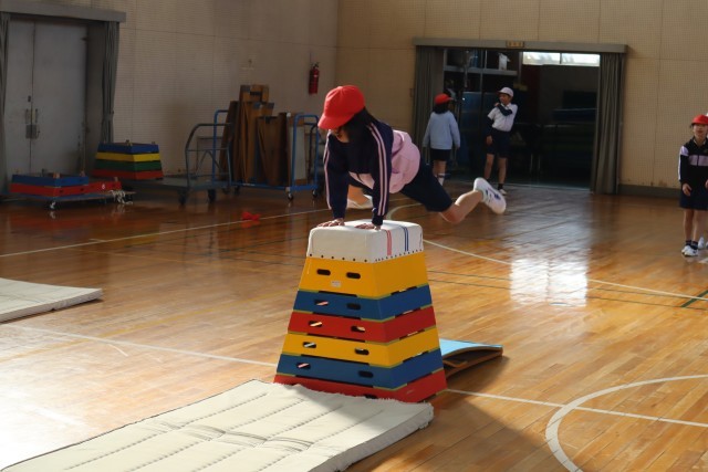 運動場ではなわとび、体育館では跳び箱の練習です。