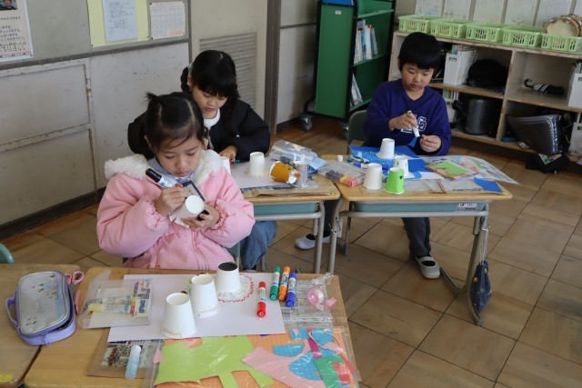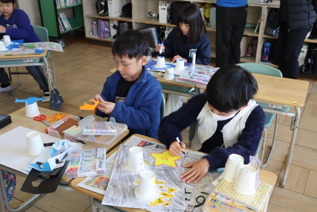 紙コップでロケットをつくっています。