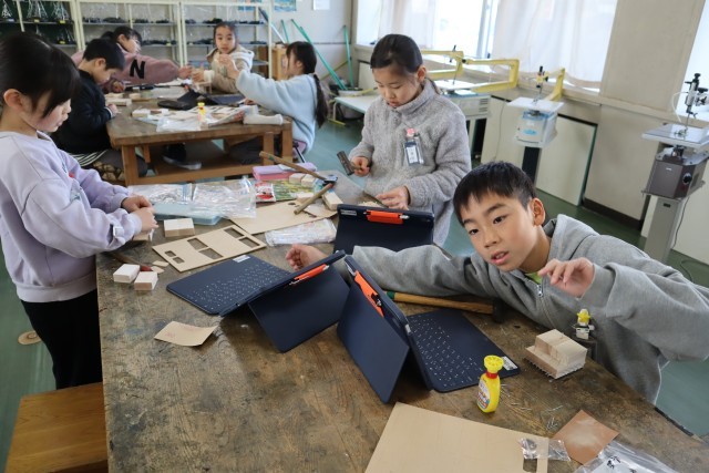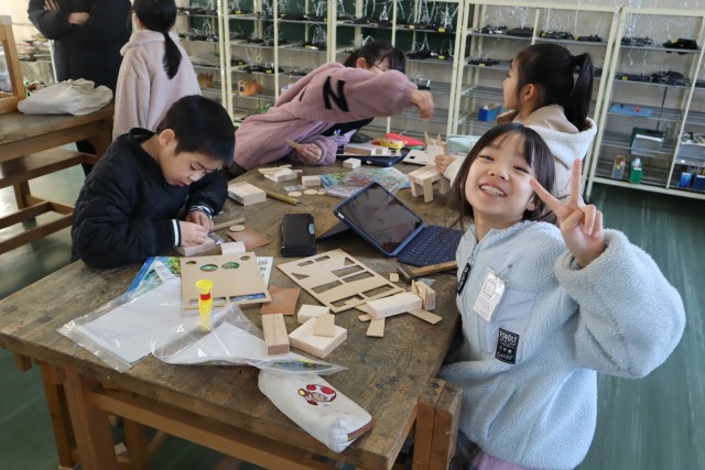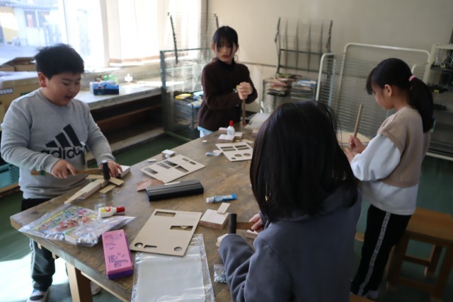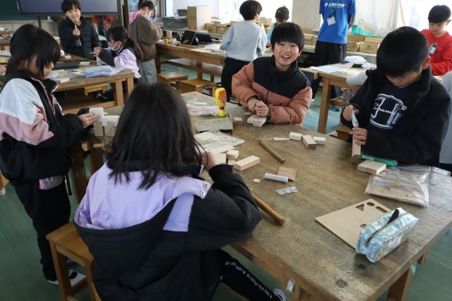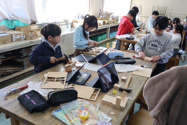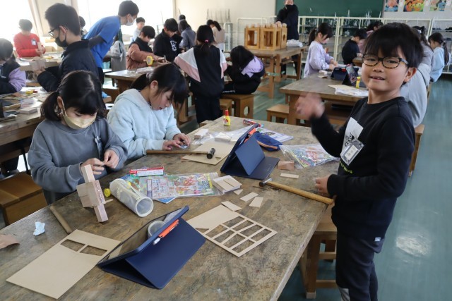 用意された木材をつなぎ合わせ、動物や乗り物などを作っています。釘を上手に使うことがおもしろい形を作る工夫につながります。どんなアイデアが生まれるかな。