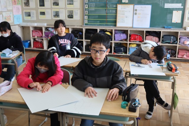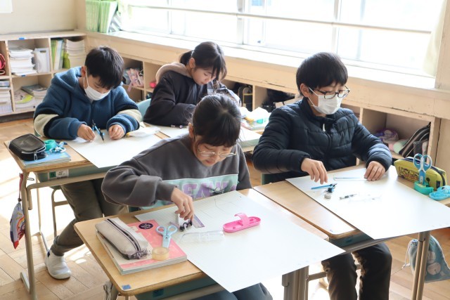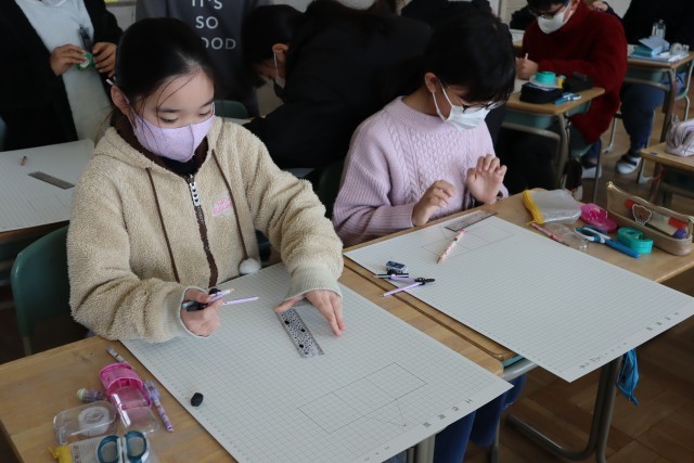 方眼紙に三角柱の展開図を描いています。この展開図が間違っていると、きちんとした立方体は作れないので、友達とも相談しながら丁寧に描いていました。