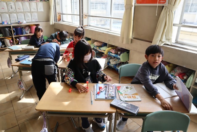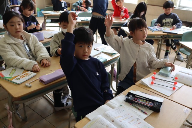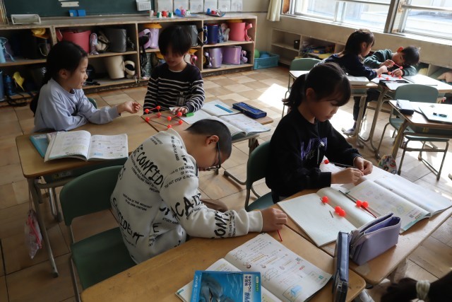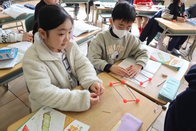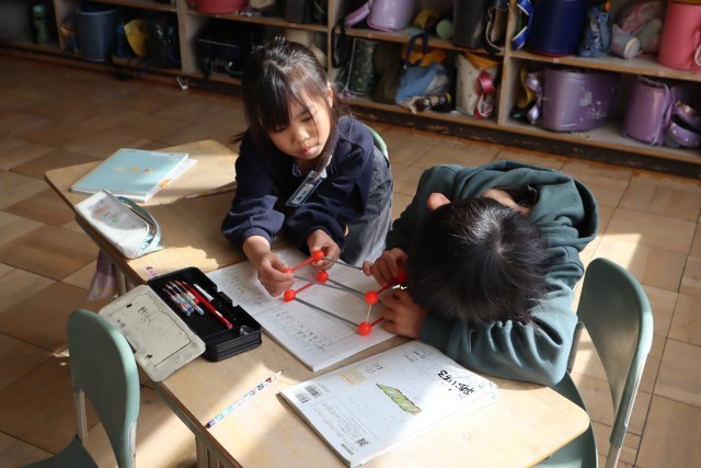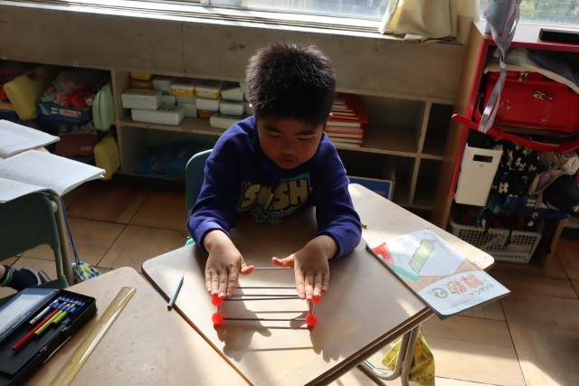 ボールと棒を組み合わせて直方体を作ります。長さの違う棒をボールに刺し、形を作っていますが、みんなきちんと直方体をつくることができました。