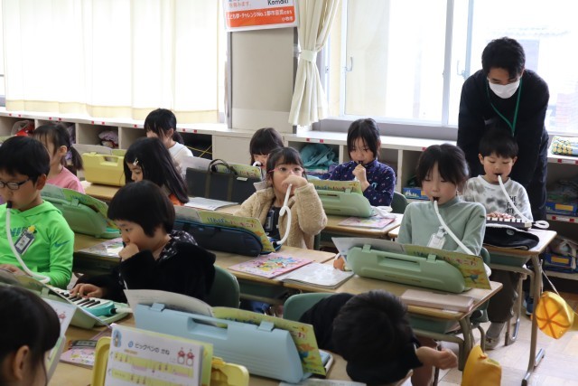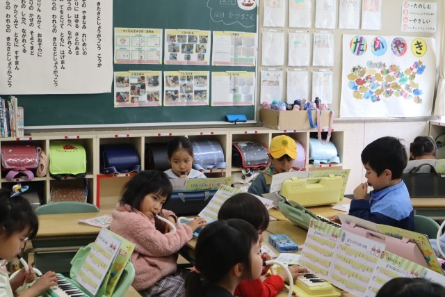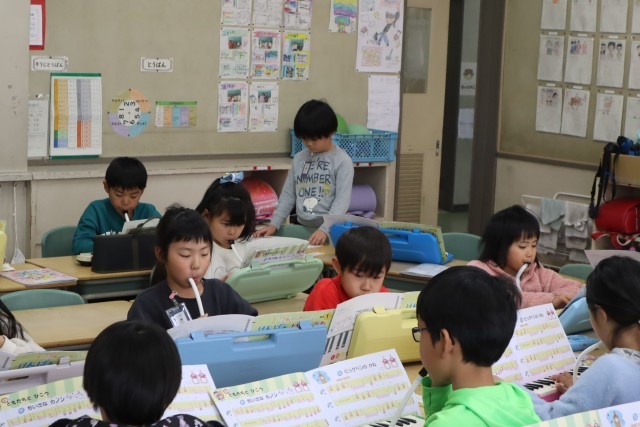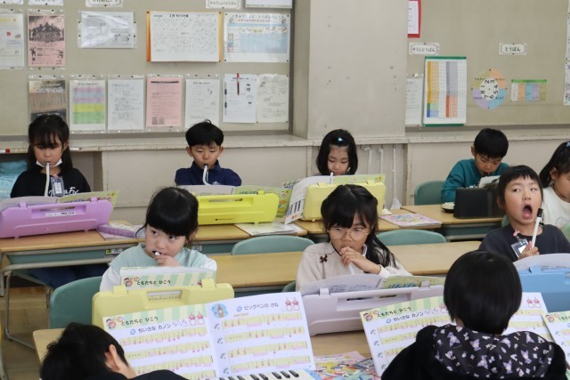 鍵盤ハーモニカを使って「ビッグベンのかね」を演奏しています。