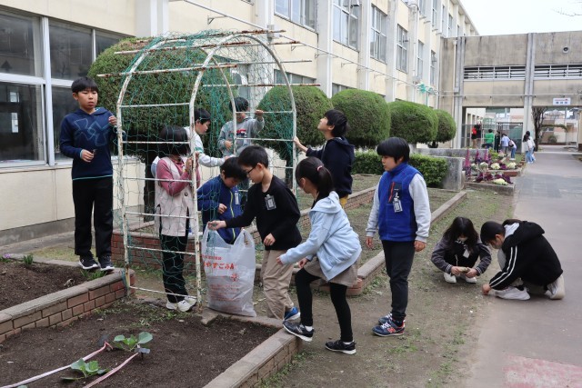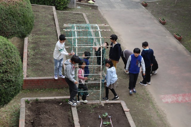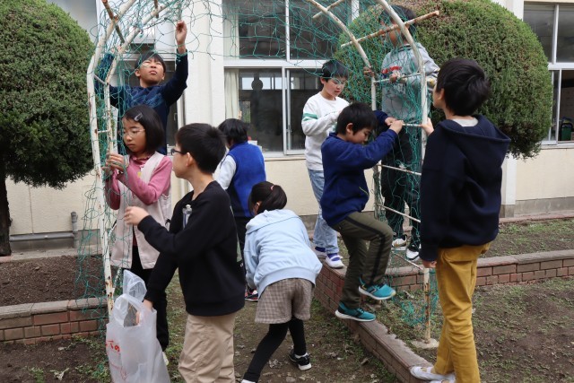 枯れたヘチマから種を取り出したり、来年のために古いつるなどをきれいに取り除いたりしています。来年度の4年生がきれいに使えるように頑張りましたね。
