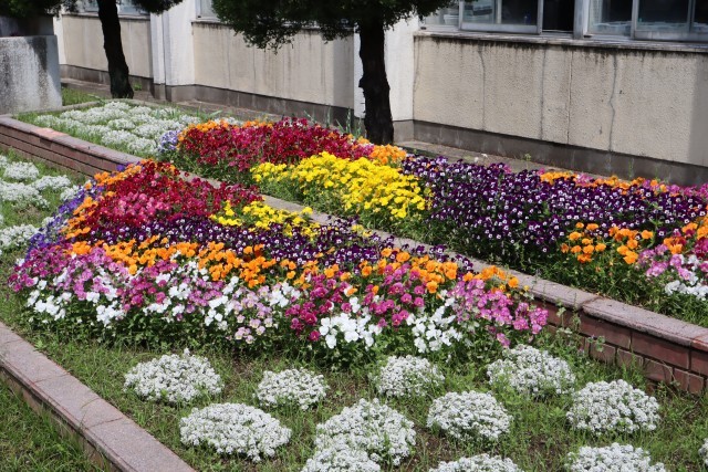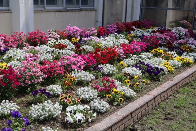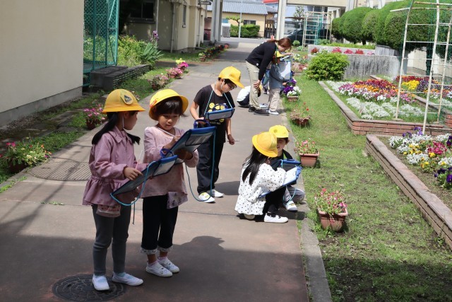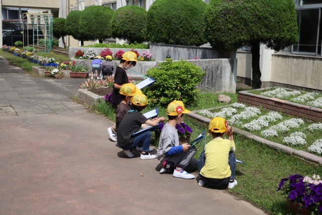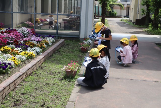中庭の花壇はお花がきれいに咲いているので、お花の絵をかいている子もたくさんいました。