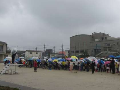 しかし、集合し終わった頃から、また雨が。幸い小ぶりで、そのまま傘をさして下校しました。帰り道、きっと友だちとの会話は弾んだことでしょう。月曜日が楽しみだね。新しいページがめくられる。真っ白なページにどんな色で何を描こうか。さようなら。