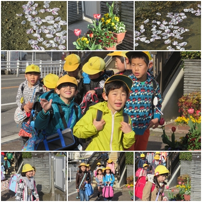 登校する子の帽子に降りかかる花片もありました。