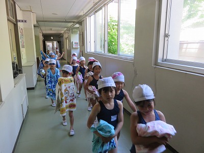 きょうは水温は23度と少し低めでしたが、気温は27度ありました。キャーキャー、ワーワー、大騒ぎのプール・デビューの授業でした。