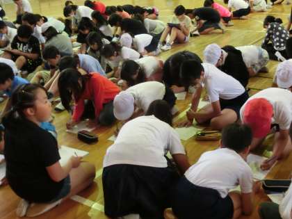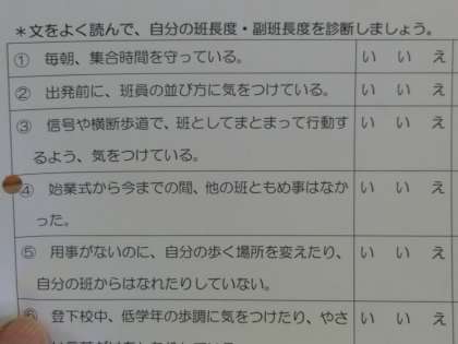 その後、「ふり返りカード」を使って日頃の活動をふり返り、班長・副班長度をチェックしました。低中学年は、高学年が頼りです。班長・副班長さん、これからも班員をしっかり見守ってくださいね。