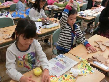 「だいたい顔くらいの大きさで」「自分の手よりも大きく」とのアドバイスを受けて、各自思い思いに紙をやぶりました。この作業は、とても気持ちのいいものです。気に入った部品(紙片)を5、6枚選びました。
