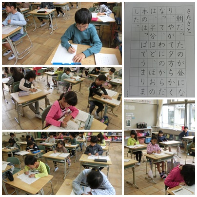 まず、1時間目に練習をしました。形がとりにくい字を何度も練習しました。「ひらがな」を、今のうちに、きちんと形よく書けるようにすることが大事です。これから、ずっと使っていく大切な「道具」ですから。2時間目に、清書を書きました。消しゴムを使わなくてもいいように、まちがえないよう気をつけました。