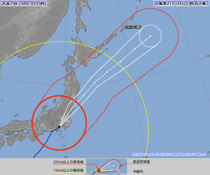 現在、小牧市に「暴風警報」が発令中です。しばらく自宅待機とし、テレビ、ラジオ等での警報の確認をお願いします。台風21号は、午前3時頃静岡県の御前崎付近に上陸し、現在、東京方面を北上中です。雨はやみましたが、時折、風が強く吹く状態です。