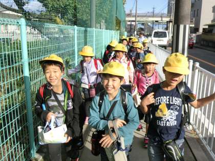 【写真:「ミートボール10コはいとったよ」下校時の話題も弁当の話で持ちきりでした。2年学年下校場面から】