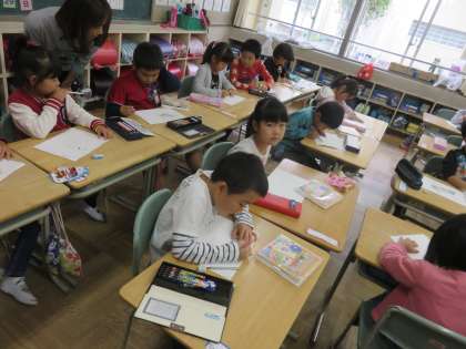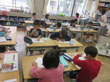 ウサギ一家をだっこしたり、よく観察したりして、絵に描いたり作文に書いたりしました。3羽の名前は「くろまる(おとうさん)」「ショコラ(おかあさん)」「チャチャ(こども)」です。さわった感じや色や形について、自分なりに表現しました。