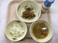 きょうの給食訪問は、6の2です。卒業まで残り4ヶ月となりました。近くの子に「卒業までにがんばりたいことは?」と尋ねても「……」だったので、まだ卒業という意識は低いのかもしれません。しかし、卒業文集を書いたり委員が編集作業をしたりしていますから、卒業に向けた準備は着々と進んでいることになります。給食を食べる前に、明日誕生日を迎える子の「牛乳カンパイ」が行われました。とても温かい雰囲気のクラスです。みんな笑顔で楽しそうです。準備中には、小声で歌を歌っている班もありました。
