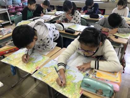 社会の時間に、愛知県の学習をしています。都道府県の名前を覚えたり、愛知県について調べたりしていきます。わたしたちのまち、小牧市は、愛知県のどこのあたりにあるのでしょう。一生懸命、地図帳で調べることができました。