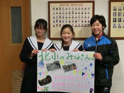 「北小のみなさんへ」と大書されたメッセージカードには「すてきなあいさつをありがとうございました!来年もまたやりましょう。〜北中生一同より〜」と書いてありました。折り紙で作った素敵な飾りもつけられています。早速、校長室のドアのところに張りだしました。みなさん、ご覧ください。