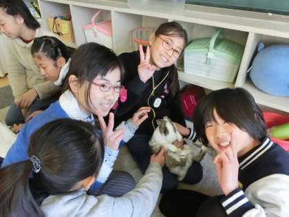 本校には、「黒丸」「チャチャ」「ショコラ」の3羽のウサギがいます。みんなの大人気のウサギです。長い放課に5組で交流することができます。とてもかわいいですよ。