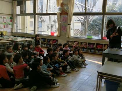 今朝は1年〜3年の子どもたちにぽけっとクラブのみなさんが読み聞かせをしてくださいました。どの子も目をキラキラ輝かせ、興味深げに耳を傾けていました。