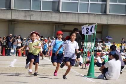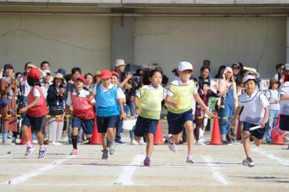 まず、競技は女子から。1年生が元気よくスタート。さすがに代表だけあって速いです。2年生にバトンパス。力走。3年から4年、5年。そして、6年へ。練習した甲斐あって、バトンパスは上手になっています。レースは、後がない白が終始リードしているように見えました。