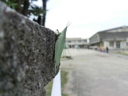 ふと見ると、一匹のバッタが門柱にへばりついて、子どもたちの方を見ていました。