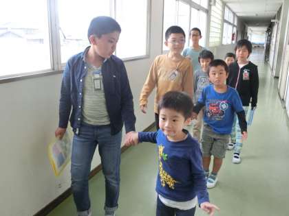 【写真「小学校たんけんだあ」:5年生に連れられて校内を回る園児の皆さんは興味津々でした。昨日の就学時健診の様子から】
