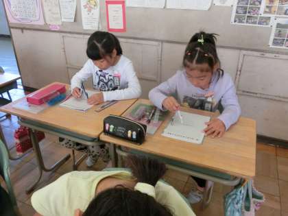 コンパスを使って、描く練習の様子です。