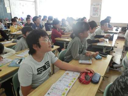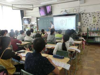 スクリーンに映し出された漢字をよく見て、書き順を覚えました。
