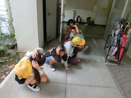 「避難訓練、ただ今地震が起こりました。児童の皆さんは、すぐに身の安全を確保してください」校内放送で、すぐに避難行動に移りました。