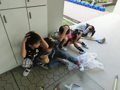 教室にいる子は机にもぐる、運動場にいる子は真ん中に集まりしゃがむ、その他の場所では、物が落ちてこないところに集まってしゃがみ頭を守る行動をとる。……