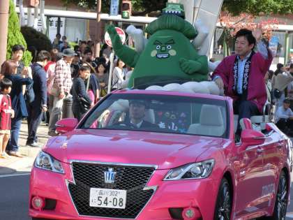 【写真「ピンクのオープンカー」:小牧山と市長さんが乗っていました。「小牧山に押し出されそうです」との言葉に観客の笑いを誘っていました。市民まつりパレードから】