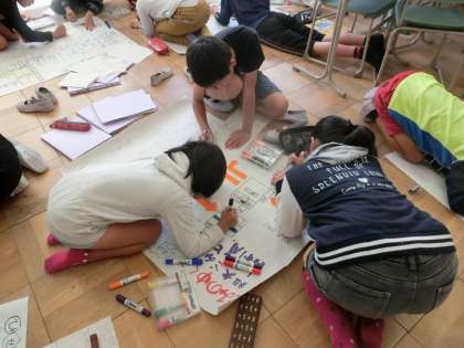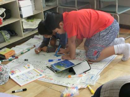 同じようなテーマを考えている友だちとグループになって、友だちに伝えるための準備をしていました。大きな模造紙に調べたことをわかりやすくまとめていました。興味のあることについてしらべていくので、どの子も生き生き取り組んでいます。つい、身を乗り出して書き込んでいる子も!