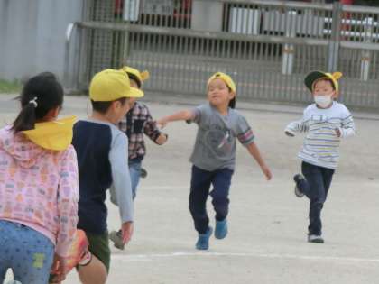 【写真「お〜い、まてぃ」:元気におにごっこをする姿があちらこちらで見られました。長放課の運動場の風景から】