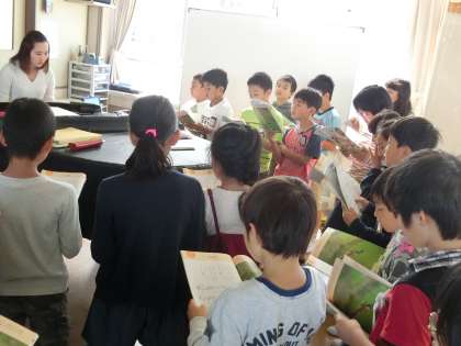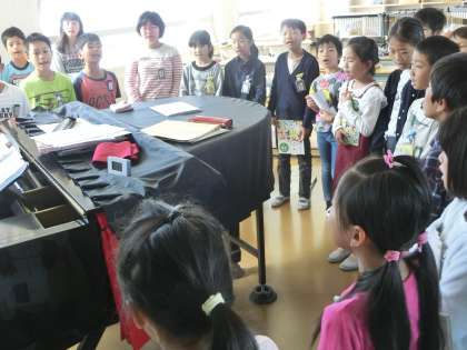 4年生がピアノを弾く先生のまわりに集まって今月の歌を歌っていました。気持ちよさそうに歌っていました。