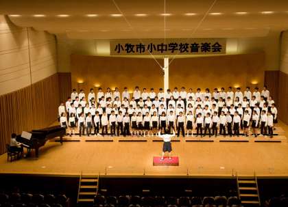 市民会館ホールで小学校で3番目、13時50分から2曲の合唱を披露しました。