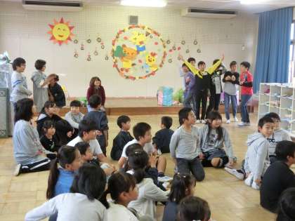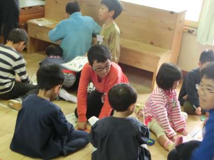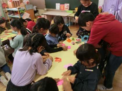 予め決めたグループごとに、色紙やゲームをして楽しみました。年中や年長の園児の相手をする5年生は、とても大きなお兄さん、お姉さんに見えました。特に、年長さんは、あと半年後には里の子の仲間入りです。お互いに楽しく交流することができました。