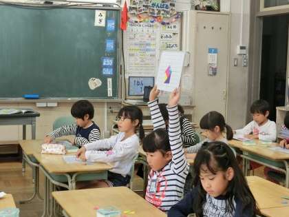 じっさいに 色板を並べて、形をつくったら、先生に見せてね。