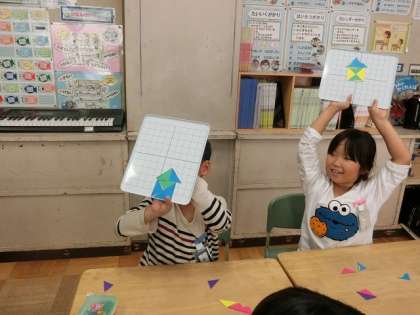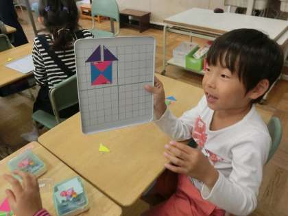 次に、自分の色板を並べて、いろいろな形をつくりました。