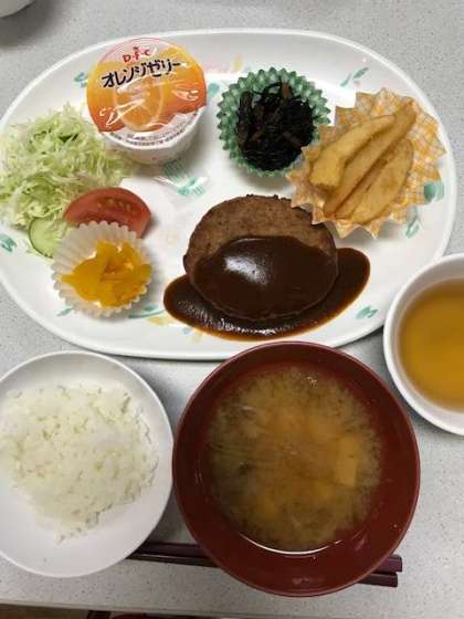2日目の夕食は、ハンバーグ定食です。みんなが大好きなハンバーグが出ました。テンションも上がることでしょう。食事係は、3回目の配膳となり、とても手際よく準備することができました。
