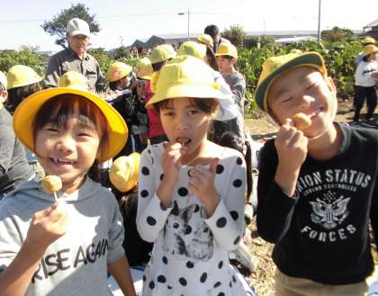 【写真「エビイモっておいしいね!」:3年生は先日エビイモの収穫にでかけました。親芋、エビイモ、孫イモを掘り出したあと、農家の奥様方が作られたエビイモ団子をいただきました】