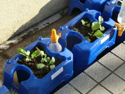 毎朝の水やりが2年生の日課です。日に日に大きくなっています。2年生は収穫できる日をとても楽しみにしています。