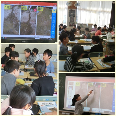 その様子をデジカメで記録、印刷し、それを基に気づいたことを発表し合いました。課題は「流れる場所によって川や川岸のようすがちがうのはどうしてだろうか」でした。